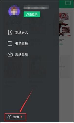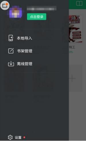 在我的书架界面,点击左上角的菜单图标,打开菜单界面,如图: