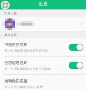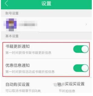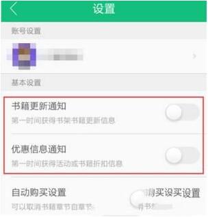 设置界面中,“图书更新通知”和“促销信息通知”默认开启。点击关闭,如图: