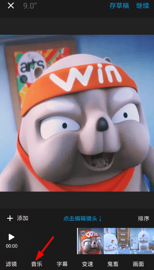 2、视频素材编辑完成后,可以进入编辑页面,选择“音乐”功能,为视频添加音乐,去除原有声音。到