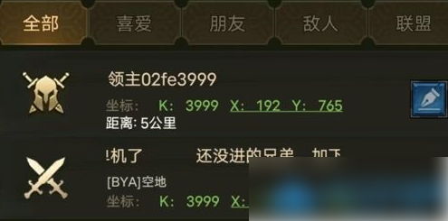 3、第三类是特殊的。属于坐标范畴,也是最重要的一类。如果你想快速找到你的联盟队友,你需要使用此功能直接定位你的盟友并与他们联手。后期如果你想寻找更多的盟友,可以通过这个方法快速定位。毕竟如果在地图上一点点寻找的话,想要找到他们就太难了。