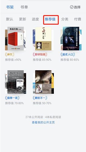 3、在列表下选择推荐值,软件就会读取我们添加到书架的书籍,并根据推荐值进行分类。