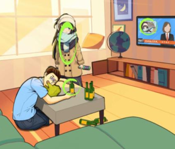 8、来到第四个场景,男的手里有酒,女的站在电视机前做汇报。