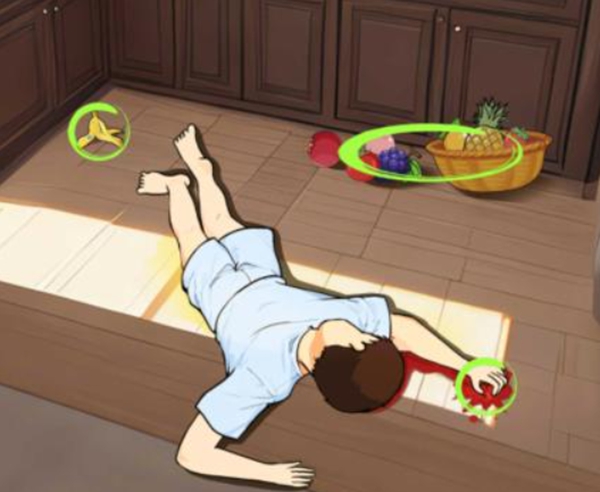 7.跳到第三个场景,看到地上有香蕉皮,有水果篮,男子手上有血。