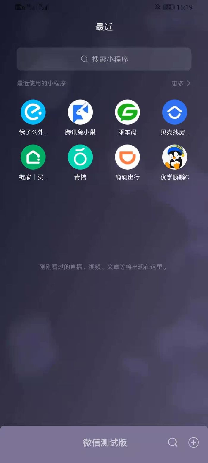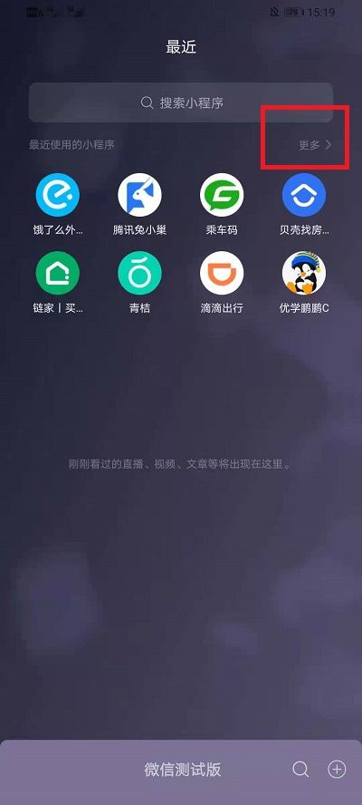 1、首先我们需要更新到微信最新版本,然后打开微信,在微信首页下拉,进入小程序收藏界面;