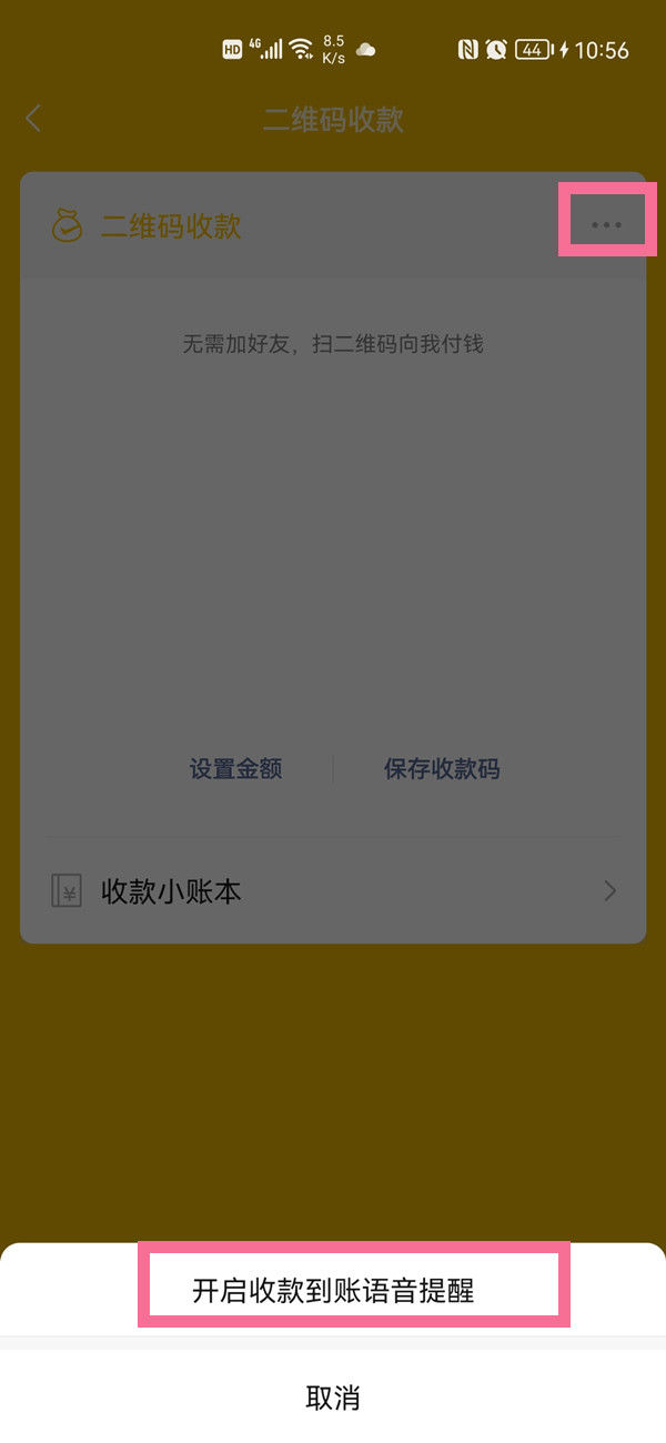 3、选择支付二维码右上角三点图标,点击开启支付到账语音提醒。