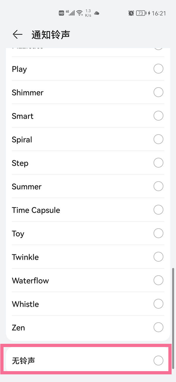 3. 点击【通知铃声】,勾选下方的【无铃声】。