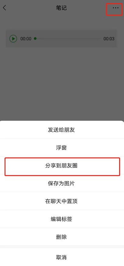 6、最后点击右上角【.】,选择分享到朋友圈,语音更新即可成功发送。
