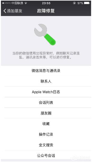 3、点击搜索后,会出现故障修复工具。下面有很多选项。有对话列表,里面有聊天记录,好友,收藏夹。