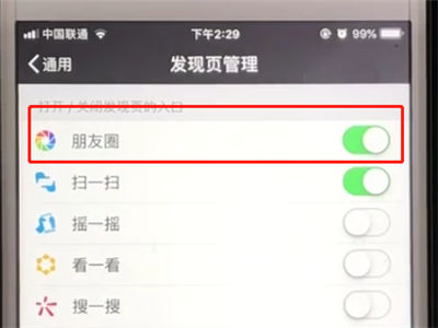 4、进入总页后,点击发现页面管理,关闭朋友圈开关。