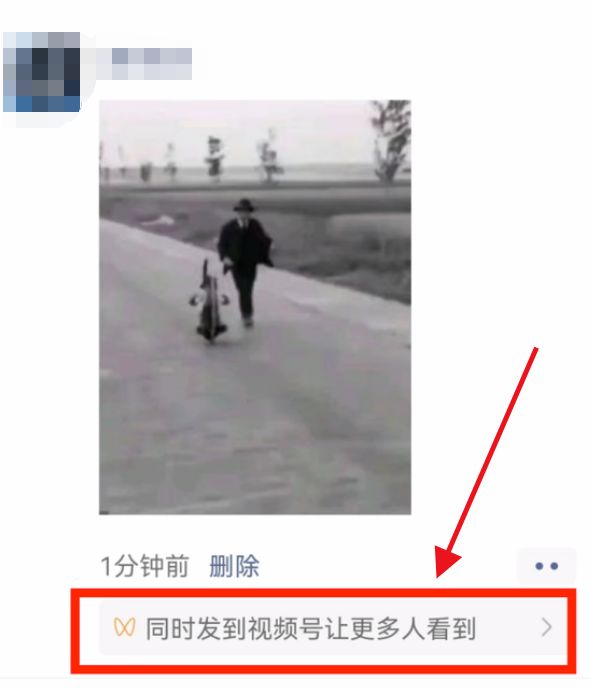 2.在朋友圈发布视频后,我们可以查看下面的小字,并将其发布到视频号,以便更多人看到。单击这行小字。