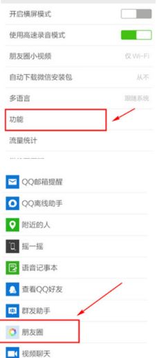 4、然后我们需要在通用界面中选择“功能”进入功能操作界面,然后在“功能”界面中选择“朋友圈”进入“朋友圈”操作界面。
