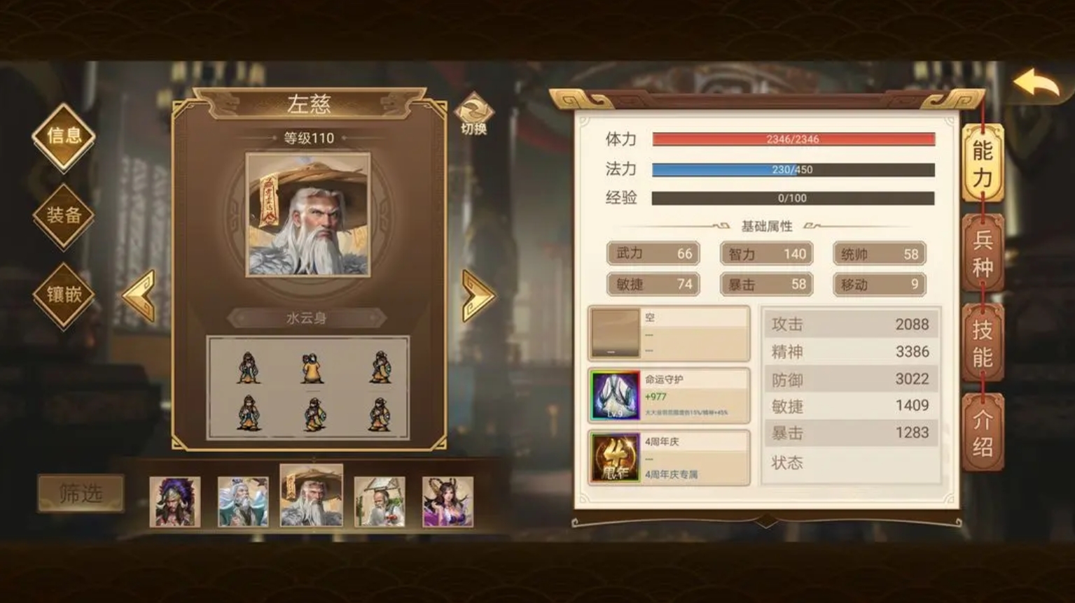 四周年助手可配备“回击”、“必打”等各种实用技能。自身和分身都可以骗取回报,进一步提高左慈的利用率。