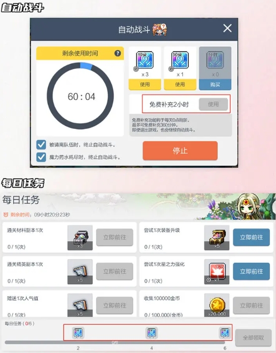 1.自动战斗中,可以获得120分钟的空闲时间(50-60级,只有60分钟)。