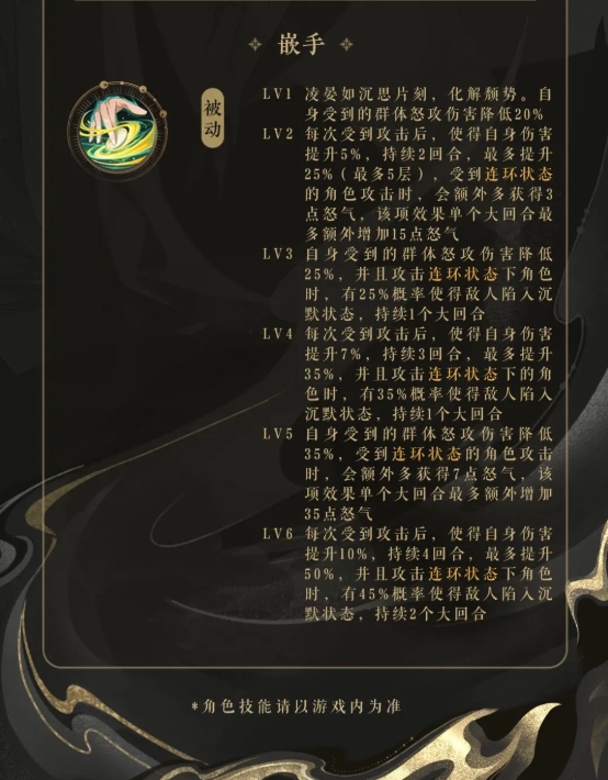 4.被动语态很容易理解。攻击标记的角色可以恢复怒气,受到伤害时可以增加自身的攻击力。每个级别持续10%,四轮最多50%。